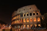 Kuten arvata saattaa, on tämä valtaisa muistomerkki erittäin näyttävä iltavalaistuksessaan. Muistomerkistä sai hyvät yökuvat aivan sen edessä sijaitsevalta pieneltä ruohikolta, jolla olikin lukuisia ihmisiä kameroidensa kanssa. Kuvat otettuamme jatkoimme vielä kävellen pitkäksi venähtäneen iltalenkkimme viimeiselle kohteelle, Colosseumille. Kello oli puoli yksitoista maanantai-iltana, mutta Colosseuminkin luona parveili ihmisiä. Itse rauniot eivät tietenkään olleet enää auki, mutta ihmiset olivat saapuneet katsomaan ja kuvaamaan kuuluisaa rakennusta iltavalaistuksessa. Pakko onkin myöntää, että Colosseum on kauneimmillaan juuri illalla. Päivällä tämä harmaa raunio jättää hieman kylmäksi, mutta illalla näyttävä valaistus saa sen heräämään henkiin aivan uudella tavalla. Colosseum onkin ehdottomasti näkemisen arvoinen pimeällä. 😮