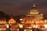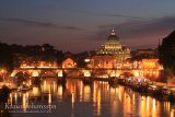 Kävelimme halki historiallisen keskustan pienten kujien aina Tiber-joen rantaan saakka, josta lähdimme seuraamaan jokea kohti länttä. Kauniisti valaistua jokirantaa oli ihanaa kävellä tuona lämpimänä heinäkuun iltana. Hieman matkaa kuljettuamme saavuimme Ponte Umberto I sillan luokse, jolta eteemme avautui oikea postikorttimaisema. Illan sininen hetki oli jo lopuillaan, mutta se jaksoi vielä värjätä osan taivaasta kauneilla väreillään. Värikkään iltataivaan alla edessämme kohosi mahtavana valtava Pietarinkirkko. Yhdistettynä etualalla näkyvään Ponte Sant’Angelon koristeelliseen siltaan, oli näkymä kuin postikortista.