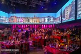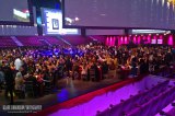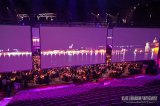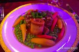 Alkupalojen sekä juomien jälkeen oli aika siirtyä illallispöytiin, jotka oli rakennettu keskelle jääkiekkoareenaa. Aluetta ympäröivät suuret videoscreenit, joille heijastettiin venetsialaisia maisemia sekä illan videokuvaa. Meidän ei tarvinnut kuitenkaan ruutuja juuri tapittaa, sillä kauniisti koristeltu VIP-pöytämme sijaitsi aivan salin keskellä olevan esiintymislavan vieressä.