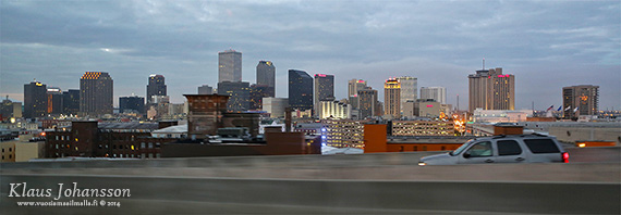 Reissumme kahdeksi viimeiseksi yöksi majoituimme New Orleansin länsilaidalle lähelle lentokenttää. Saimme huoneen hotellin yläkerroksista, josta aukeni maisema huonolasisten ikkunoiden läpi kohti keskustan siluettia. Lähistöllä kohosi myös suuri Huey P. Long Bridge, jonka ilta-aurinko värjäsi kauniisti.