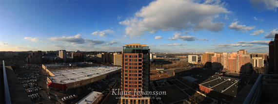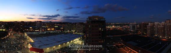 Etäisyydet Washingtonin kaupunkialueella ovat kuitenkin lyhyitä ja 18-kerroksisen asuinrakennuksemme ylimmästä kerroksesta näkee helposti Washingtonin keskustaan. Ylimmässä kerroksessa sijaitsee talon asukkaiden käytössä oleva punttisali, jonka yhteydessä on myös pieni ulkoparveke. Kävin siellä eilen illalla valokuvaamassa ympärillä hämärtyvää kaupunkia. Keli oli muuttunut huomattavasti keskiviikkoista kylmemmäksi, joten kuvatessa jäätyivät nopeasti näpit. Myös voimakkaan puuskainen tuuli teki hämäräkuvauksesta hankalaa, kun kamera heilui hienoisesti tuulessa, tehden osasta kuvia hieman epätarkkoja.