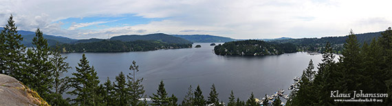 Keskiviikkona keli oli alkuviikkoa parempi, joten ajoimme iltapäivällä Deep Coven seudulle, missä kävelimme porukassa Quarry Rockille. Keli oli hieman pilvinen, mutta viileä ilma ei haitannut alkuunkaan paikoin puuskuttamista aiheuttavalla luontopolulla. Maisema polun päästä löytyvältä kalliolta oli jälleen upea ja alla onkin siitä tällä kertaa nappaamani panoraama, jossa koko Deep Cove on nähtävissä.