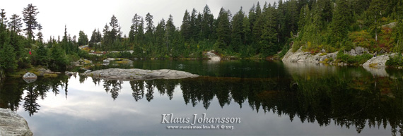 Söimme kalliolla olevalla suurella lohkareella eväämme ja lähdimme paluumatkalle. Matkalla takaisin parkkipaikalle päätimme koukata läheisellä Mystery Lakella. Se olikin hyvä päätös, sillä vaikka järvelle johtava metsäpolku olikin hiihtorinteitä mutaisempi, oli se silti maisemiltaan paljon leveää laskettelurinnettä mielenkiintoisampi. Myös itse järvi oli ihan nätti, vaikka taivas olikin mennyt pilveen.