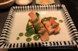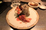 Ensimmäinen meille tarjoiltu ruoka oli alkuruoan virkaa toimittava simpukka, joka oli täytetty kotilon lisäksi hedelmäisellä salaatilla. Lisäksi mukana oli kaksi raakana tarjoiltavaa mini-mustekalaa. Nam. Pienen empimisen jälkeen kaikki edellämainittu saatiin kuitenkin syötyä. Seuraavaksi eteemme tuotiin erilaisia pieniä asetelmia salaattia sekä pieniä lihanpaloja. Niitä mutustellessamme kokki toi paikalle itse pääasian, eli ison klöntin Koben härkää. Raaka liha esiteltiin meille, jotta voisimme hyväksyä sen käytön ateriamme tekoon. Punertava liha oli todellakin ”marmorinen” eli rasvajuonteet kulkivat pitkin sitä kaikkiin suuntiin. Ei-mihinkään perustuvan hyväksynnän annettuamme, lihanpala puolitettiin ja laitettiin paistolevylle, mistä alkoi ihanan kuuloinen tirinä. Lihan saatua jonkin verran ruskeaa väriä, se pilkottiin pieniin kuutioihin, joita sitten annosteltiin lautasellemme sienien, valkosipulilastujen sekä monenlaisen salaattimme kanssa nautittavaksi.
