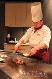 Koben härkää tarjoaa Kobessa muutama ravintola ja me valitsimme hotellillamme sijaitsevan Kitano-ravintolan, jonne on syytä tehdä varaus. Ravintolan ovelta meidät ohjattiin paikoillemme, jotka eivät sijaitse pöydässä, vaan valtavan keittolevyn ääressä. Sen toisella puolen henkilökohtainen(!) kokkimme oli valmiina aloittamaan illallisemme valmistuksen. Ruokaa edessämme valmistaessaan kokki jutteli pieniä mukavia ja tarjoilija kävi jatkuvasti katsastamassa, että meillä oli kaikki hyvin. 🙂