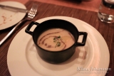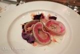 Illallisvalintamme oli ravintolan viiden ruokalajin maistelumenu. Menun alkuun tuli kokin tervehdyksenä hyvä kermainen alkukeitto, joka meni kurkusta muutamalla kulauksella. Valitettavasti en tullut ottaneeksi kuvaa ravintolan kuukausittain vaihtuvasta menusta, mutta kahtena alkuruokana tarjoiltiin kivasti aseteltuna katkarapuja sekä erikoinen asetelma erilaisia vihanneksia muutamalla kukan 💡 terälehdellä varustettuna. Kaikki oli kuitenkin syötävää ja aivan erinomaisen makuista.
