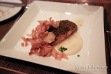 Pääruokana tarjoiltiin tyynenmeren lohta sekä erittäin makoisaa naudan sisäfilettä pieneksi siivutettuna. Jos jo alkuruoat olivat erinomaiset, olivat pääruoat suorastaan taivaallisia. Eikä illan viimeisenä tarjoiltu jäätelöinen mokkavanukas jättänyt sekään kylmäksi, vaikka itse en niin kahvin mausta pidäkään. Kivana yllätyksenä jälkiruokalautanen oli myös koristeltu merkkipäiväämme juhlistaen. 🙂