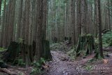 Reitin vastapäivään kulkevalle reitin ensimmäinen osuus kulkee vanhan metsätien pohjaa. Maisema on ensimmäiset pari kilometriä hieman tylsää nuorta metsää, sillä aluetta aiemmin hallinneet jättiläispuut kaadettiin kaikki 1900-luvun alussa. Vanhan sahan sammaloitunut perustus reitin alkupuolella toimii muistutuksena noista ajoista. Myös reitin varrella menneisyys muistuttaa itsestään, sillä jopa yli metrin korkuisia valtavia kantoja on edelleen pystyssä siellä täällä. Liekö puut kaadettu aikanaan tosiaan noin korkealta, vai ovatko kannot kenties jatkaneet kasvuaan vielä puiden kaatamisen jälkeen? Oli selitys kannoille kumpi tahansa, on näky melko surullinen. Vaikka uusi metsä onkin saanut jo kasvaa aikansa ja peittää rinteen, on sen metsäpohja hyvin steriili aiemmin alueella vapaasti kasvaneeseen sekametsään verrattuna.