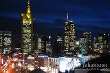 Yliopistolta kävelimme kohti keskustaa ohittaen matkalla kaupungin valtavan messukeskuksen sekä sen maamerkkinä kohoavan 257-metrisen MesseTurmin, joka on kaupungin toiseksi korkein rakennus. Koska meillä oli aikaa, ajoimme ratikalla joen eteläpuolta ja saimme mahtavat valokuvat keskustasta hieman kauempaa nähtynä. Keskustaan palatessamme oli jo hämärtynyt, mitä olimme odottaneet, sillä hämärän tullessa pilvenpiirtäjien tuhansiin ikkunoihin sekä rakenteisiin syttyvät valot. Kävimmekin uudemman kerran tavaratalon katolla ihailemassa maisemaa ympärillä. Lopulta ajoimme ratikalla vielä pienen ympyrän kautta takaisin päärautatieasemalle ja palasimme kello kahdeksaksi hotellillemme Mainziin. Takana oli uskomattoman onnistunut päivä huikeissa maisemissa!