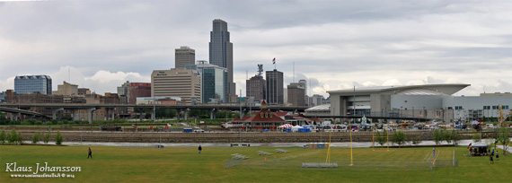 Jatkoin matkaani Omahan keskustaan jossa suuntasin keskustan viereltä valuvan mahtavan Missouri-joen rantaan. Tämä kuuluisa joki erottaa toisistaan Omahan ja Council Bluffsin kaupungit, joista jälkimmäinen sijaitsee joen vastarannalla Iowan osavaltion puolella. Joen yli kulkee suuri moottoritiesilta sekä hieman yläjuoksun suuntaan pienempi kävelysilta. Pysäköin auton kadunvarteen ja kävelin sillalle. Tästä Nebraskan ja Iowan rajalta avautui hieno maisema Omahan keskustaan jossa kohoaa muutama tasaisesta maisemasta hyvin erottuva rakennus. Kaupungin korkein rakennus on 198-metrinen The First National Bank Tower pilvenpiirtäjä, joka on valmistunut vuonna 2002.
