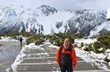 Tie numero 80 päässä sijaitsee pieni Mount Cook Village, joka on lähtöpiste Mount Cookin valloitukselle. Meillä oli aikomuksena käydä pienellä tunnin vaelluksella alueen poluilla, mutta alueelle olikin satanut edeltävänä yönä uutta lunta ja lämpötila oli nollan tienoilla. Emme olleet varautuneet aivan näin kylmiin keleihin, joten vaellus sai tällä kertaa jäädä. Muutamalla polulla oli myös voimassa lumivyöryvaara, joten asiaa kaikkialle ei olisi edes ollut. Hotellin ilmoitustaululla vaarasta todisti kopio vaelluksella kadonneen malesialaisen turistin passista.