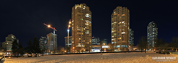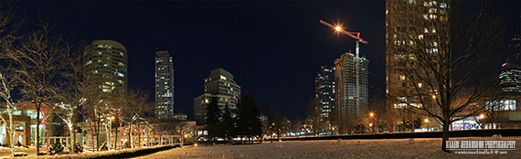 Asuinalueemme Metrotown on voimakkaasti kehittyvä alue, jonka muutos näkyy hyvin valokuvaamisissani rakennusprojekteissa, joita on käynnissä kaikkialla ympärillämme. Mukavasti Burnaby on panostanut myös jonkin verran julkisiin jouluvaloihin, joita ihmisten omat valot täydentävät tornitalojen tuhansissa ikkunoissa. Ylhäällä korkeuksissa loistavat omat valomme eivät vain valitettavasti näy alas, vaan ovat vain omana ilonamme.