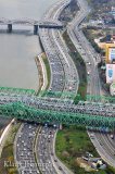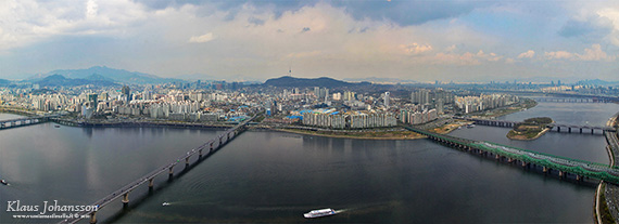 Hyvin syöneinä otimme hissin 249-metrisen rakennuksen huipulle. Ylhäältä aukeavat melkoiset maisemat yli koko läntisen ja eteläisen Soulin, aina naapurikaupunki Incheoniin saakka. Tässä vaiheessa viimeistään käy selväksi, että Soul on todellakin maailman suurimpia kaupunkeja, sillä kukkuloiden lomaan asettunut asutus on tiivis ja korkeita rakennuksia on joka puolella. N Seoul Tower -näköalatorni Namsan vuoren huipulla on myös hyvin nähtävissä, samoin pitkät matkat Hanin jokivartta halki keskustan. Joen eteläpuolella pitkin joen reunusta soljuu 10-kaistainen moottoritie täynnä autoja.