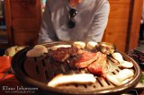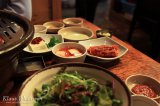Ai että, se tirinä ja tuoksu ovat jotain mahtavia, kun suuri annos lihaa paistuu aivan silmien edessä. Lihan lisäksi tarjolla on riisiä, sekä kymmenkunta lautasellista erilaisia korealaisia kastikkeita ja muita aineksia. Niitä voi sitten oman mielensä mukaan joko lisätä grilliin tai nautiskella lihan kanssa ohessa.