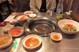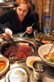 Keskustassa hakeuduimme pienen sivukadun varrella olleeseen korealaiseen barbequeen. Korealainen barbeque eli sikäläisittäin galbi, on Euroopassakin kuuluisa ruokatyyppi. Kyse on loistavaa grillilihaa tarjoavista ravintoloista, joissa istutaan pöytään ja tilataan annos raakaa marinoitua lihaa isosta listasta. Valinnan jälkeen henkilökunta laittaa pöydällä sijaitsevan kaasulla tai kuumilla hiilillä lämpiävän paistinlevyn lämpenemään. Kun liha sitten hetken kuluttua tuodaan, grillitaan se itse kuumalla paistinlevyllä ja syödään sellaisenaan. Toisinaan henkilökuntakin käy kääntelemässä lihoja, jos homma ei näytä länkkäriltä sujuvan.