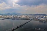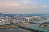 Korkeuden puolesta näkymä voisi yltää pidemmällekin, mutta Soulin ilma on selkeästi saasteista harmaa. Jälkikäteen mietittynä onkin uskomatonta, miten saasteeton Soulia vielä suurempi Tokio olikaan. Soulissa ilman vaihtumiseen vaikuttaa heikentävästi kaupunkia ympäröivät kukkulat, jotka estävät ilmavirtojen vapaan kulkemisen. Rehellisyyden nimissä on silti myönnettävä, että Etelä-Koreassa yksityisautoilu silminnähden Japania suositumpaa, mistä suuri osa saasteista on peräisin.