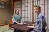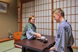 Huoneen väliseinät (fusumat) ja niiden liukuovet (shojit) ovat läpinäkymättömiä pahvista ja paperista tehtyjä suorakulmioita. Tatamilattialla sijaitsee matala pöytä kahdella jalattomalla tuolilla. Pöydältä löytyvät termospullo sekä kaksi teevatia. Niistä huonepalvelija saapui hetken kuluttua annostelemaan meille tervetuliaisteen. 🙂