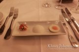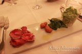Koska olimme iso seurue, oli helpointa että kaikki valitsivat saman kolmen ruokalajin illallisen. Ensimmäiseksi meille tuotiin keittiön terveisinä halkaistu muna, sekä jotain vaahtoa ja pieniä vihannespaloja. Kyseessä olisi saattanut olla viiriäisen muna, tosin arvelimme sen olevan jonkin verran tarjoiltua pienempi. Alkuruokana tarjoiltiin puolestaan lampaan suikaleita kera maukkaan hedelmäsalaatin sekä kuivattua chiliananasta.