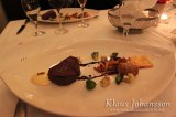 Pääruokana tarjoiltiin kiehuvassa vedessä kypsennettyä peuraa, sekä makoisasti täytettyjä perunoita kera sienien ja pienen suklaisen kastikkeen. Jälkiruoka muodostui suklaakakusta, jäätelöstä sekä päärynän paloista.