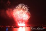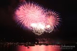 Me jäimme suosiolla hieman kauemmas rantaa kulkevan kävelytien varteen, mikä osoittautui hyväksi valinnaksi. Paikalta näki helposti rannan edustalla kelluvalta lautalta ammutut raketit – esteettä ja ilman ympäröivää tungosta. Keli oli lauantai-iltana poutainen ja lämmin, mikä lupasi hyviä olosuhteita ilotulitukselle. Ennen tapahtuman alkua näkynyt auringonlasku vuorten taakse oli kaunis alustus tapahtumalle. Itse ilotulituksesta päätin ottaa videon, vaikkakaan jo vanha kamerarunkoni ei olekaan hirveän herkkä hämärässä videokuvaamiseen. Kuitenkin tätä suuremmaksi ongelmaksi muodostui ilotulituksen pituus, sillä reilun kahdenkymmenen minuutin jälkeen kamerani ilmoitti yllättäen, että muistikortti on täynnä ja se oli sitten siinä. Viisi viimeistä minuuttia jäivät siten valitettavasti pois ensimmäisen illan spektaakkelista.