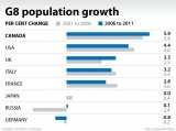 Kanadassa tehdään joka viides vuosi suuri maanlaajuinen väestönlaskenta. Näistä viimeisin valmistui viime vuonna (2011) ja tuoreimpien tilastojen mukaan Kanadan väkiluku on nyt 33 476 688 henkeä, missä on lisäystä 5,9% edellisestä vuoden 2006 laskennasta. Väestönkasvu on myöskin kiihtynyt, sillä vuosina 2001 – 2006 kasvu oli hieman matalampaa, noin 5,4%. Kanadan väkiluku onkin tuplaantunut sitten vuoden 1961 ja peräti kymmenkertaistunut viimeisen 150 vuoden aikana. Kanada on näillä lukemilla kaikkein nopeimmin kasvava G8-maa, väkirikas Yhdysvallat mukaan lukien.