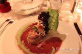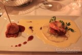 Päätimme kokeilla tällä kertaa viiden ruokalajin Chef’s Tasting Menun, jonka ruokalista vaihtuu viikottain. Alkuun saatu kokin terveinen oli pieni piiras, jota seurasi ensimmäisenä alkuruokana tarjoiltu hummeriravioli kera katkarapu tempuran. Toisena alkuruokana tarjoiltiin ankkaconfit suflee pienillä pekonipaloilla. Kaikki alkuruoat olivat kyllä maukkaita, mutta kovin voimakkaita yhdenkään ruoan erilaiset maut eivät mielestämme olleet.