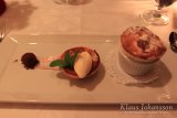 Pääruokana tarjoiltiin melkoisen kookas naudan sisäfilee, mitä seurasivat kaksi jälkiruoka-annosta. Näistä ensimmäinen oli simppeli hunajamelonijäädyke ja viimeisenä tuotiin karpaloleivonnainen vaniljajäätelöllä sekä armanjakkisuflee kera pienen suklaatryffelin. Sufleessa maistui ehdottomasti liian voimakkaasti kananmuna, mikä toi syödessä eloisasti mieleen munakkaan. Ei kaikkein paras assosiaatio jälkiruoan kohdalla.