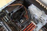 Kokoonpanon asentaminen oli helppoa. Ensiksi vanha prosessorituuletin pois ja sitten emolevyn taakse tuleva tukilevy paikalleen. Lauhdutin ja tuulettimet paikalleen, ja lopuksi jäähdytinelementti kiinni prosessorin päälle. Kone kiinni ja virrat päälle – toimi kuin laakista! 🙂