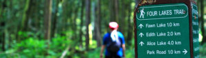 Padolta lähtee lukuisia vaelluspolkuja, joista me päätimme kiertää hieman alle kolmen kilometrin mittaisen lenkin. Reitin nimi vaihtelee sen varrella, mutta pääosan matkaa sen nimi on Shinglebolt Trail. Se kulkee kauniissa metsä- ja joenrantamaisemissa. Itse polku on hyvässä kunnossa ja kylttejä on tarpeeksi usein oikean reitin löytämiseksi. Karhuista ei tällä reitillä tarvitse huolehtia, sillä varsinkin näin kauniina sunnuntaina ulkoilijoita oli liikkeellä valtavasti ja erityisesti koiran omistajat tuntuivat suosivan reittiä.