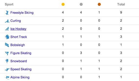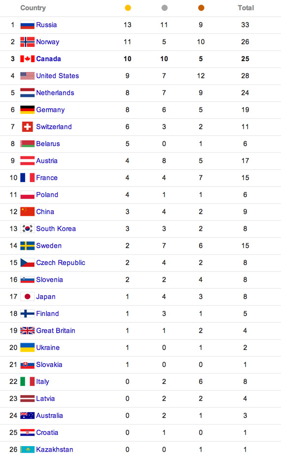Sotšin talviolympialaiset ovat ohitse ja eri mailla on kisamenestyksen loppuarvion aika. Kanadan voidaan sanoa suoriutuneen kisoista erinomaisesti, sillä kultamitaleja tuli kotiin yhteensä 10 kappaletta, hopeamitaleja 10 ja pronssejakin 5 kappaletta eli yhteensä 25 mitalia. Kultamitalien määrässä Kanada ylsikin sijalle kolme, heti Venäjän ja Norjan jälkeen, yhden mitalin edellä rakasta etelänaapuriamme Yhdysvaltoja. Mitalien kokonaismäärässä sijoitus oli kuitenkin neljäs, sillä Yhdysvallat sai kokonaisuudessaan kolme mitalia enemmän, näistä suurin osa pronssisia.