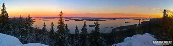 Ite Kolin vaaramaisema ei ole muuttunut sittemmin, mutta lumeton talvi on aiheuttanut sen ettei edes 347 metriä korkealla Kolilla ollut joulun välipäivinä mainittavasti lunta. Normaalistihan Kolilla nautitaan runsaasta lumentulosta ja puut ovat paksun lumen peitossa. Tästä seikasta huolimatta kiipesimme silti Ukko-Kolin huipulle ihailemaan kansallismaisemaa Pieliselle. Suuri järvi oli saanut ylleen jo jääpeitteen, mutta Euroopan pisimmän jäätien avautuminen Lieksaan on vielä monen viikon päässä.