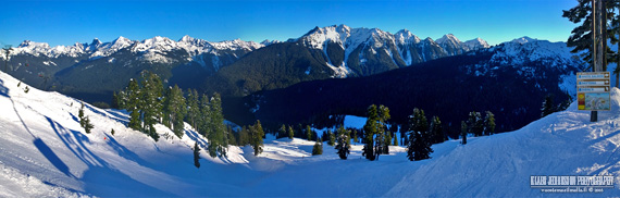 Tuumasta ryhdyttiin toimeen viime lauantaina, jolloin sääennustus lupasi keliksi sinistä taivasta sekä muutaman asteen pakkasta. Lasketteluolosuhteiden vuorella piti siis olla hyvät, sillä lunta on satanut tänä talvena jo yhtä paljon kuin koko viime talvena ja lumensyvyys keskuksen ala-asemalla on hieman alle kolme metriä. Lähdimme matkaan aamukuudelta ja pimeässä ajoimme noin tunnissa Abbotsfordnissa sijaitsevalle Sumasin raja-asemalle (jossa muuten kuvataan ”Kanadan Rajalla” televisiosarjaa). Rajalla ei kulunut pitkään ja aamun kajastaessa pääsimme jatkamaan matkaamme kohti vuorta. Noin 60 kilometrin mittainen tie ylös on kaunis ajo ja lumi lisääntyi joka kilometriltä, kunnes lopulta ajoimme autoletkassa hangen keskelle jyrsityssä lumikourussa.