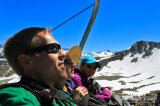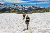 Päivän ohjelmanumeronamme oli huikean kauniin High Note Trailin vaelluspolun kiertäminen puoliksi. Kiersimme Niinan kanssa koko kymmenen kilometrin mittaisen reitin viimeeksi vuonna 2012 juurikin näihin samoihin aikoihin, jolloin alppikukat kukkivat kauneimmillaan sulamisveden muodostamien kirkkaiden purojen solistessa alas vuorenrinnettä. Näin oli myös tällä kertaa ja vehreät niityt antoivat upeaa kontrastia valkoisille huipuille sekä siniselle taivaalle.
