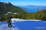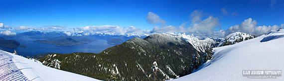 Laskimme muutaman mäen, jonka jälkeen palasimme takaisin Mount Strachanin puolelle, jonka huipulle kipusimme. Ylhäältä aukeavat maisemat olivat uskomattomat, sillä kauden aikana melkein 11 metriä lunta saanut vuorenhuippu oli aivan valkoisen puuterin peitossa. Ylhäältä aukeni upea maisema leijonankorville, St. Mark’s Summitille sekä alas Howe Soundin upeaan vuonoon. On kiehtovaa miten eri maailmassa 1400 metrin korkeudella eletään vielä näin huhtikuun alussa, jolloin merenpinnantasolla nautitaan jo +15 asteen päiviä ja puihin avautuu lehdensilmuja.