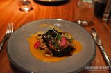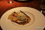Pääruoaksi tarjolla oli yleiseen tapaan lihaa, kalaa tai kasvisvaihtoehto, joista päädyimme molemmat Waguy-nautaan, täydennettynä kurpitsa-marrowsoseella sekä makoisilla talvimarjoilla ja pensasmustikoilla. Jälkiruoan kohdalla ei ollutkaan vaihtoehtoa ja molemmille tarjoiltiin briejuusto-saksanpähkinä jäätelöä keksin kera.