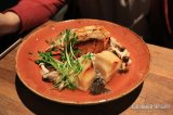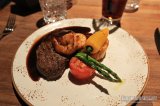 Pääruoaksi vaihdoimme valintojamme päikseen, minun ottaessa kunnolla grillatun pihvin Cajun-maustetulla katkaravulla sekä vihanneksilla. Niinan valinta oli eksoottisempi mustaturska hummerin pyrstöllä, parinaan japanilaisia Siitake- ja Shimejisieniä, riisiä sekä Genmaicha-teen jyviä. Pääruoan kohdalla koimme tuloksen olevan tasapeli ja molemmat vaihtoehdot tekivät meihin vaikutuksen laadullaan.