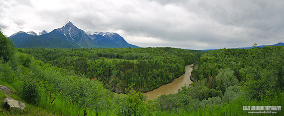 Paluumatkalla valtatielle ihailimme vielä kerran Hazeltonista avautuvaa maisemaa, jota hallitsee kerrassaan upea vuorijono jonka korkein huippu on 2076 metriä korkea ja terävä Hagwilget Peak. Valokuva ei yksinkertaisesti tee oikeutta sille, miten näyttävä vuori oikeasti on.