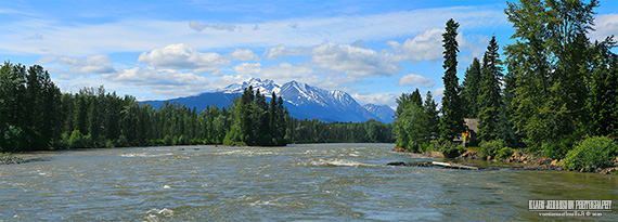 Edempänä maisemat muuttuvat huikeiksi kun rannikon vuorijonot alkavat kohota ympärillä. Pieni mutta pysähdyksen arvoinen nähtävyys löytyy pienen New Hazeltonin kyläpahasen läheltä paikallistiellä alkuperäiseen Hazeltonin kylään. Hazelton sijaitsee upealla paikalla kohdassa jossa Bulkley River yhdistyy suurempaan Skeena Riveriin. 570 kilometriä pitkä Skeena River on British Columbian toiseksi pisin joki heti Fraser Riverin jälkeen ja sen kautta virtaa valtavat määrät vuoristoon satavasta sadevedestä takaisin Tyyneenmereen.