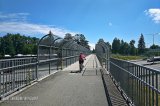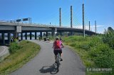 Päätimme suorittaa yhteensä 53 kilometriä pitkän reittimme myötäpäivään, joten suuntasimme asemalta ensi töiksemme kohti Port Mann Bridgeä. Olen itse pyöräillyt 10-kaistaisen suursillan ylitse kerran aiemmin, joten tiesin ylityksen olevan yksi parhaiten suunnitelluista. Täysin erillinen pyöräkaista on leveä ja etäällä liikenteestä, joten sitä pitkin on turvallista ja myös miellyttävää ylittää leveä Fraser River.