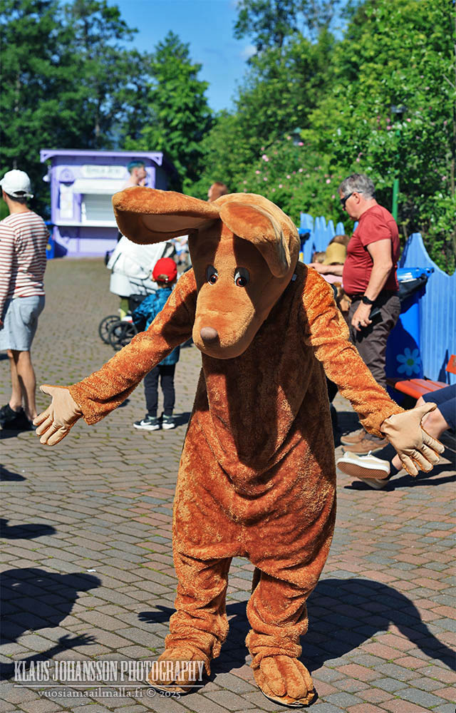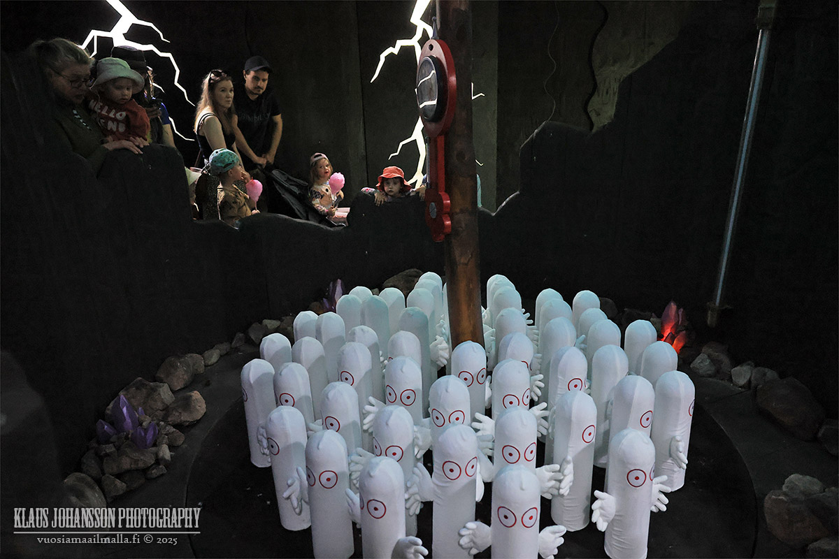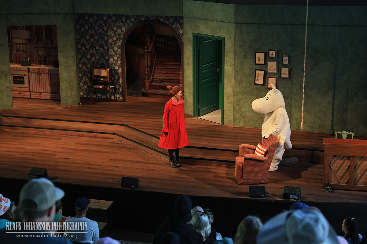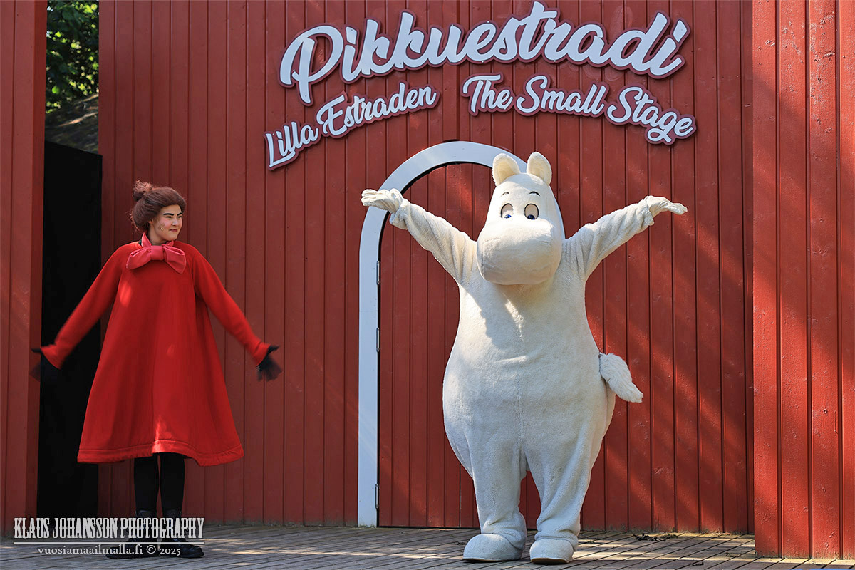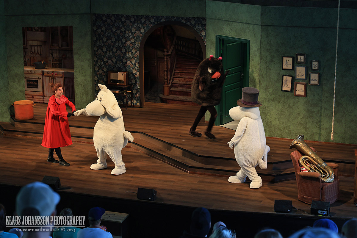 Itse muumihahmot esiintyvät päivän aikana kahden eri teatterin lavoilla, minkä lisäksi sarjan hahmoihin voi törmätä siellä täällä teemapuiston alueella. Ihmishahmojen kuten Pikku Myyn ja Nuuskamuikkusen kanssa lapset voivat jutella, mutta itse muumit eivät tuntuneet puhuvan, mikä ei kuitenkaan haittaa perheen pienimpiä.