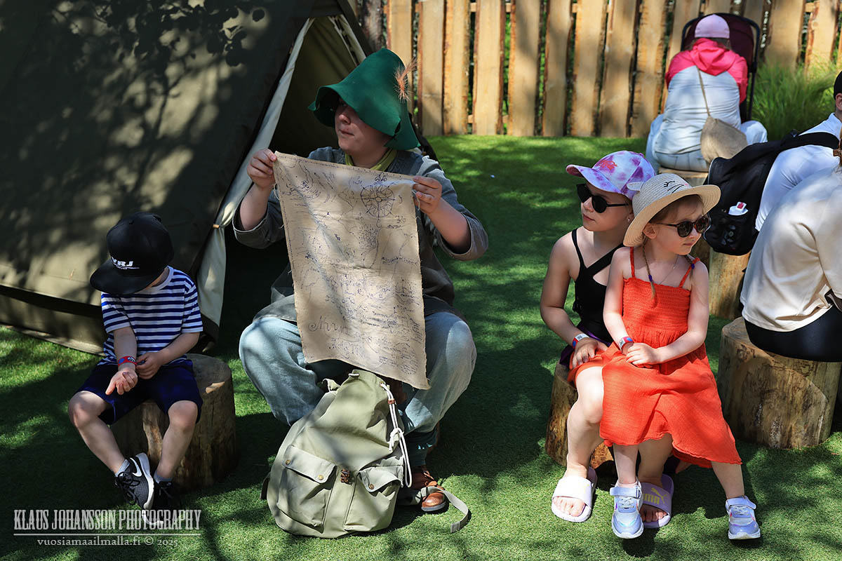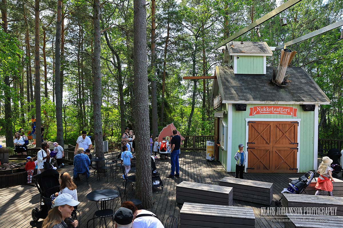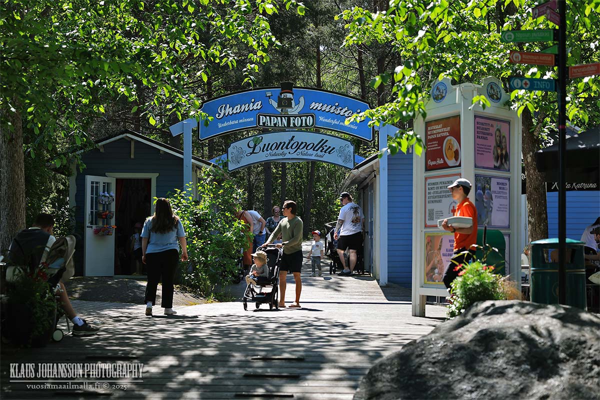 Muumimaailma sijaitsee Naantalin edustalla pienellä Kailon saarella, jonne johtaa 250-metrinen ponttonisilta. Paikalla oli jo aamutuimaan runsaasti kesälomalla olevia lapsiperheitä, mutta alueella oli silti tilavaa liikuskella, emmekä joutuneet päivän aikana jonottamaan mihinkään.