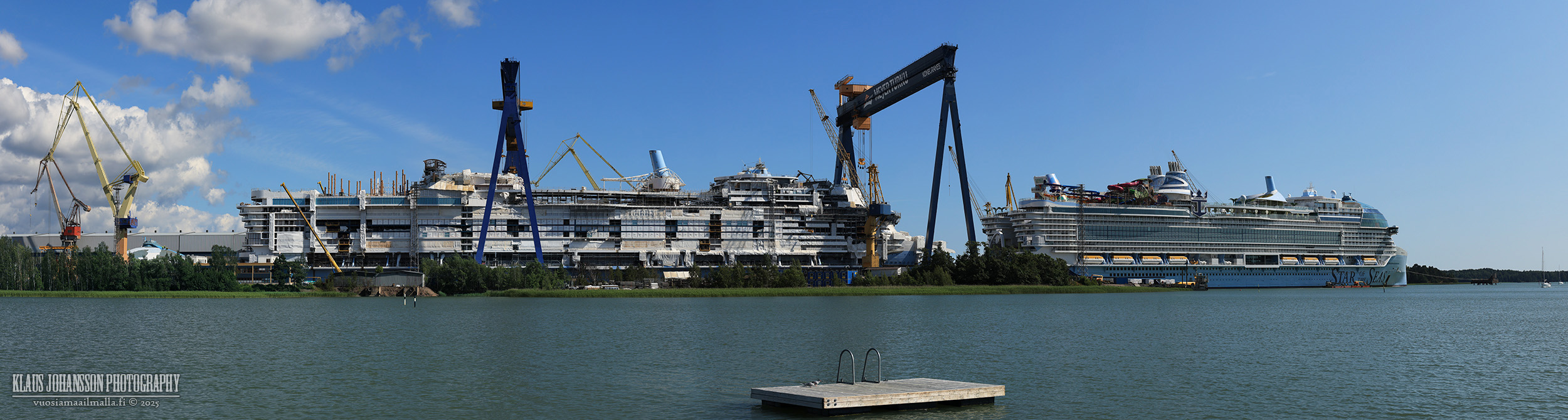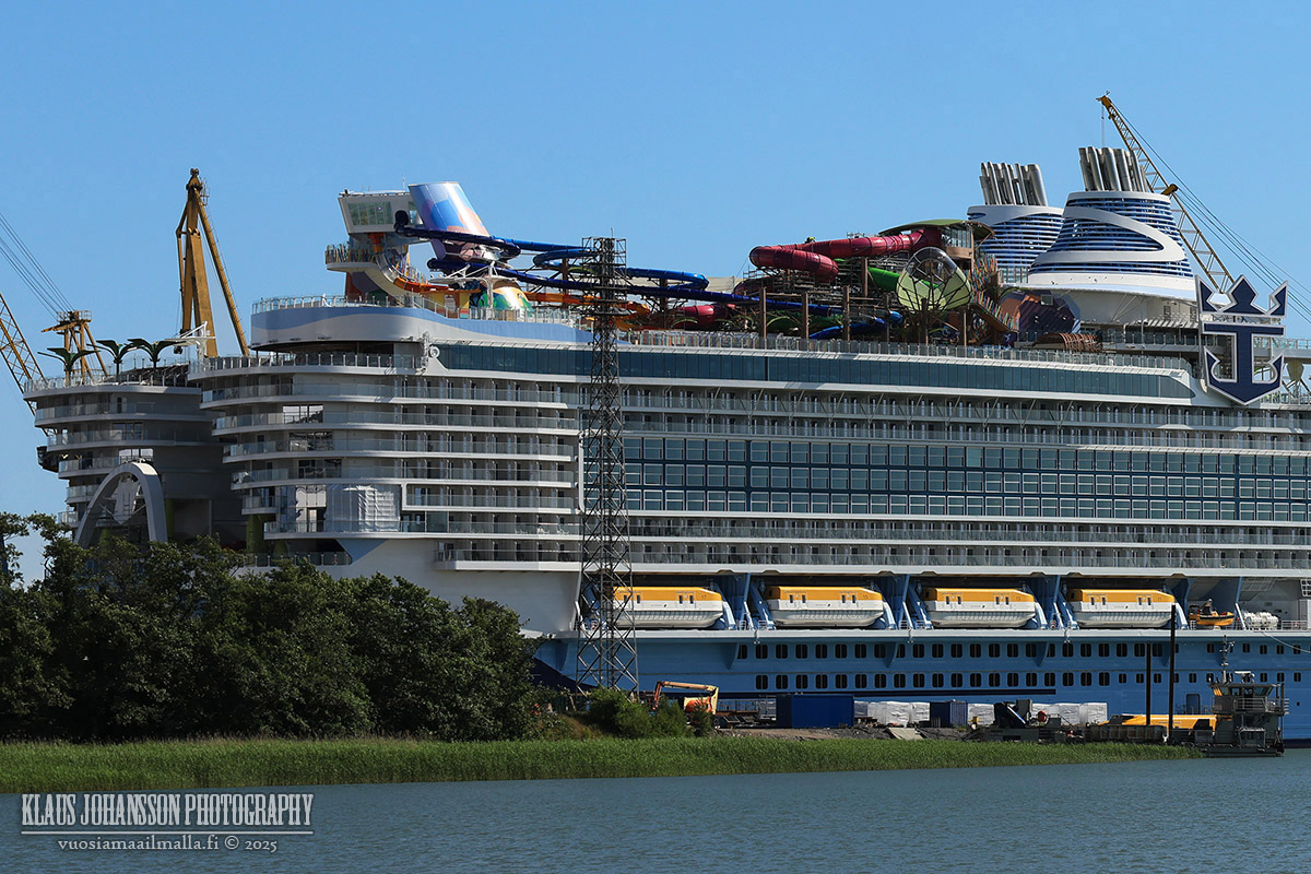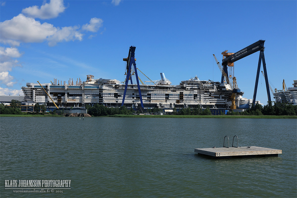 Juuri äskettäin Alaskan risteilyllä olleina meitä kiinnosti kovasti maailman suurimman risteilyaluksen näkeminen ja näky olikin mahtava. Etäisyyden vuoksi aluksen kokoa oli kuitenkin hitusen vaikea hahmottaa siitäkin huolimatta, että laivan vieressä rakennettiin toista, ensi vuonna luovutettavaa saman kokoista sisarlaivaa.