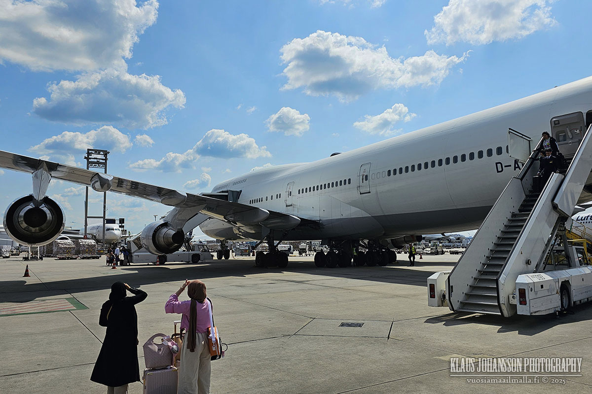 Pitkä lento sujui kuitenkin hyvin ja pian olimme Frankfurtissa, jossa jumbojettimme joutui yllättäen pysäköimään kauas terminaalista ja jouduimme siirtymään bussikuljetukseen. Olemme lentäneet Lufthansalla useita kertoja, mutta edellisestä lennosta Frankfurtin kautta oli ehtinyt vierähtää kymmenen vuotta. Tässä ajassa Frankfurtin kenttä oli ehtinyt uudistua siinä määrin, että vaihtaminen Helsingin koneeseen oli viimeinkin kätevää, eikä vaatinut vaeltamista sokkeloisilla käytävillä.