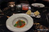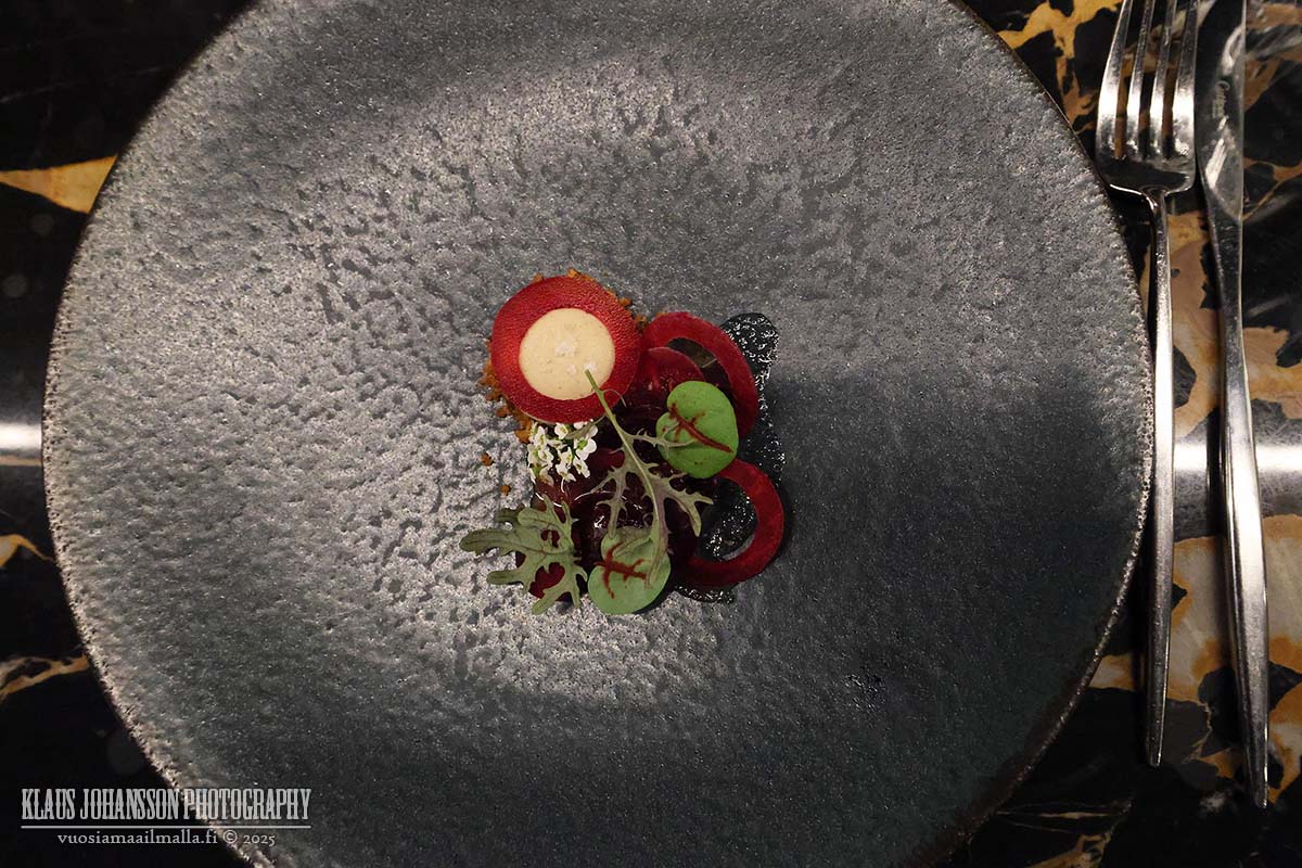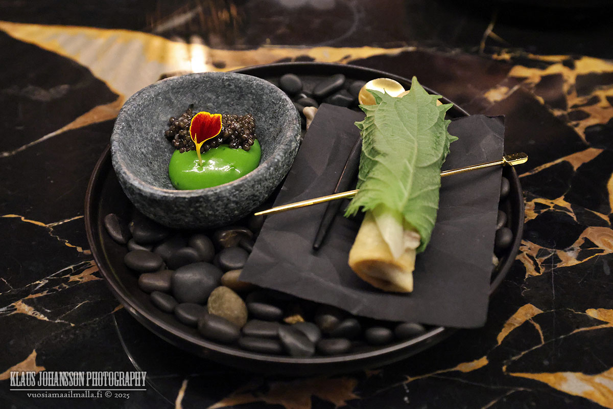 Tätä seurasi annos punajuurta sekä paahdettua maa-artisokkaa vietnamilaisen nuoc cham -kastikkeen kera. Annos oli ehkä illallisen heikoin osa, mutta silti maistuva. Todella hyvä oli puolestaan merellinen osterisimpukka kirsikan ja japanilaisen savuponzun kanssa nautittuna. Alkupalat kruunasi viimeisenä kevätrulla kanaa ja porsasta, jonka parina oli aprikoosia ja Niinalla vielä lisäksi kaviaaria.