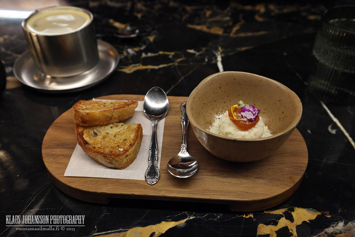 Jälkiruoka-annoksia illalliseemme kuului yhteensä kaksi kappaletta, joista ensimmäinen oli juustoinen hapanleipä, jonka päälle leviteltiin vuohenjuustopannukakkua, kvitteni-hedelmää sekä valkosuklaa hippusia. Erikoisen kuuloinen kombinaatio oli todella herkullinen ja tarjoiltiin lisäksi nätisti aseteltuna.