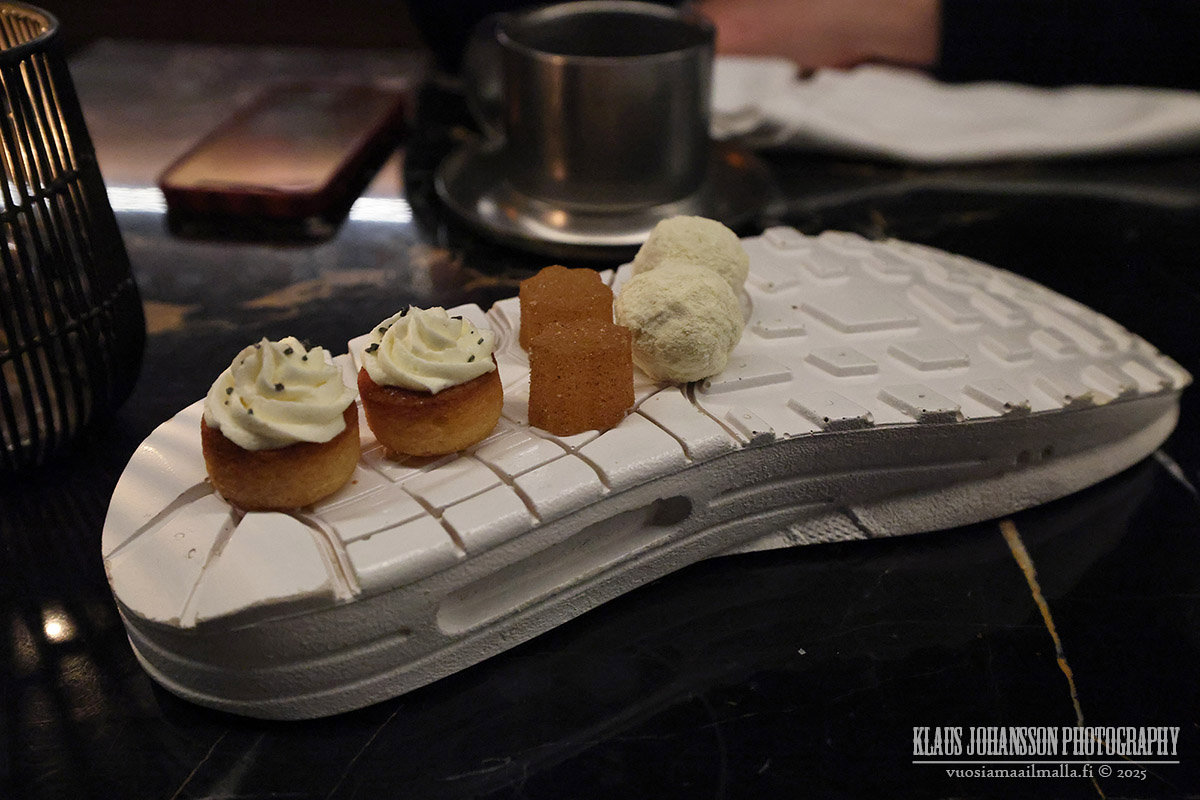 Huonommaksi ei jäänyt myöskään toinen jälkiruoka, joka oli porkkanajäätelöä päällään appelsiinia sekä tonka-papua. Illan viimeinen ruoka tuli puolestaan listan ulkopuolelta ja tarjoiltiin erikoisesti kengänmuotoisella asettimella. Kyseessä oli ravintolan perustajan lapsuudesta rakas omenaleivos, jännästi kolmeen erilliseen muotoon pilkottuna.