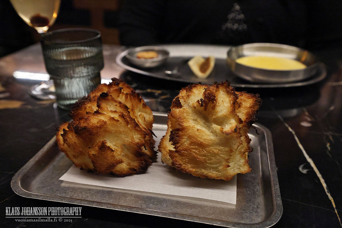 Hieman yllättäen illallinen ei alkanut minkäänlaisella kokin tervehdyksellä, vaan pian eteemme tuotiin jo ensimmäinen alkuruoka. Ravintolan ruokalistaan tulee muutoksia noin kuuden viikon välein, mutta sillä on monia pysyviä annoksia, kuten ensimmäisenä tarjoiltu ”juustopurilainen”. Siinä erikoisesti valmistettua leipää dipataan sulaan Mimolette-juustoon, minkä lisäksi leivälle voi asettaa makoisaa hirvitartarta. Ruoka oli ensimmäiseksi alkupalaksi yllättävän täyttävä ja suupieliä heruttava annos.