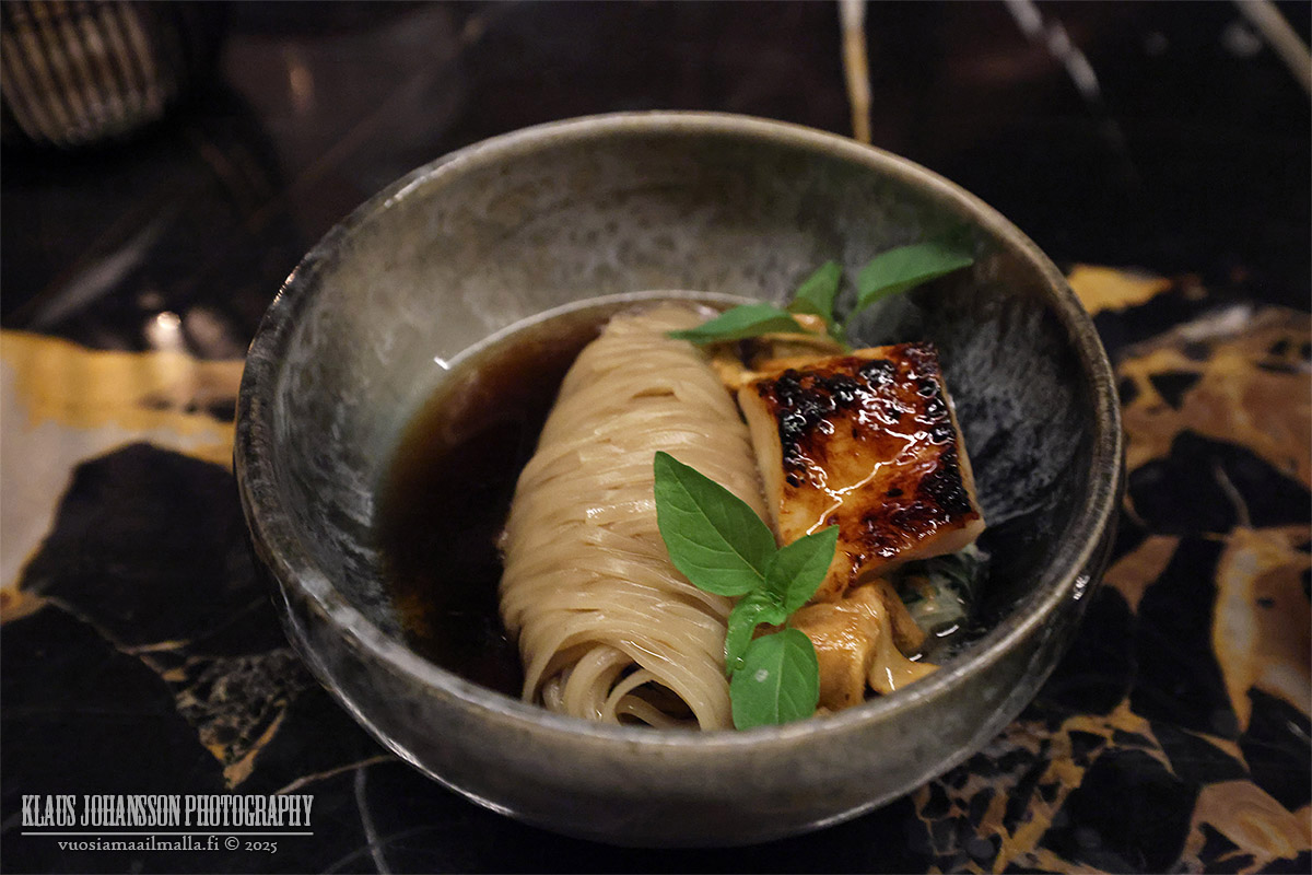 Erinomaisten alkuruokien jälkeen siirryimme pääruokien puolelle, minkä aloitti hiiltynyt sabelkala nuudelin ja sieniliemen kanssa tarjoiltuna. Annos oli uskomattoman maukas ja miellyttävä syödä, sekä myöskin täyttävä. Niinalla nuudelin päälle oli ripoteltu vielä hippunen tryffeliä, mikä sopi hyvin annokseen.