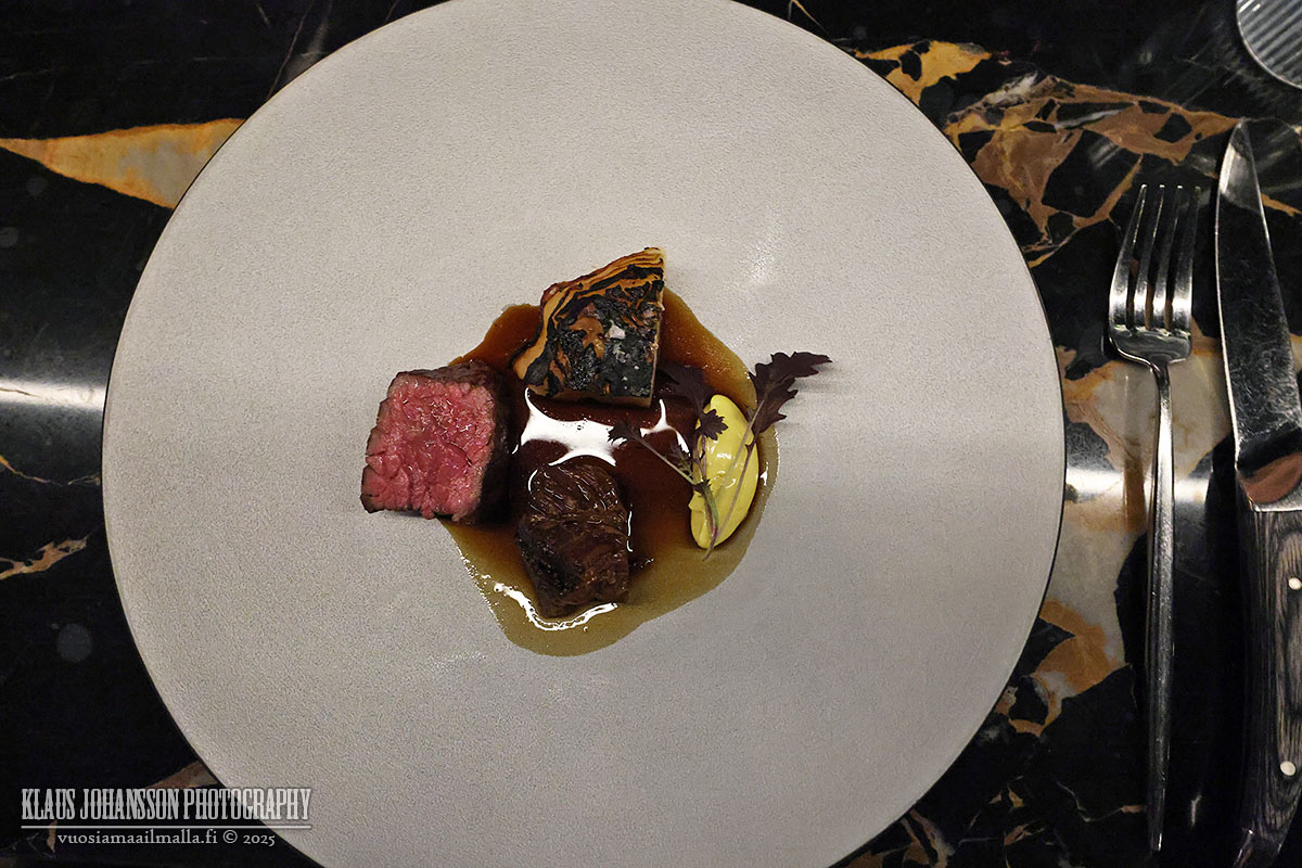Perinteisempää linjaa edusti toisena pääruokana tarjoiltu naudan haudutettu poski ja sisäfilee ranskalaisen vadouvan-currykastikkeen keskellä. Ruoka edusti sangen normaalia hienostoravintolan pääruoka-annosta, mutta Niinalla lihan korvasi vielä pala parasta viitosluokan mureaa Wagyu-nautaa.