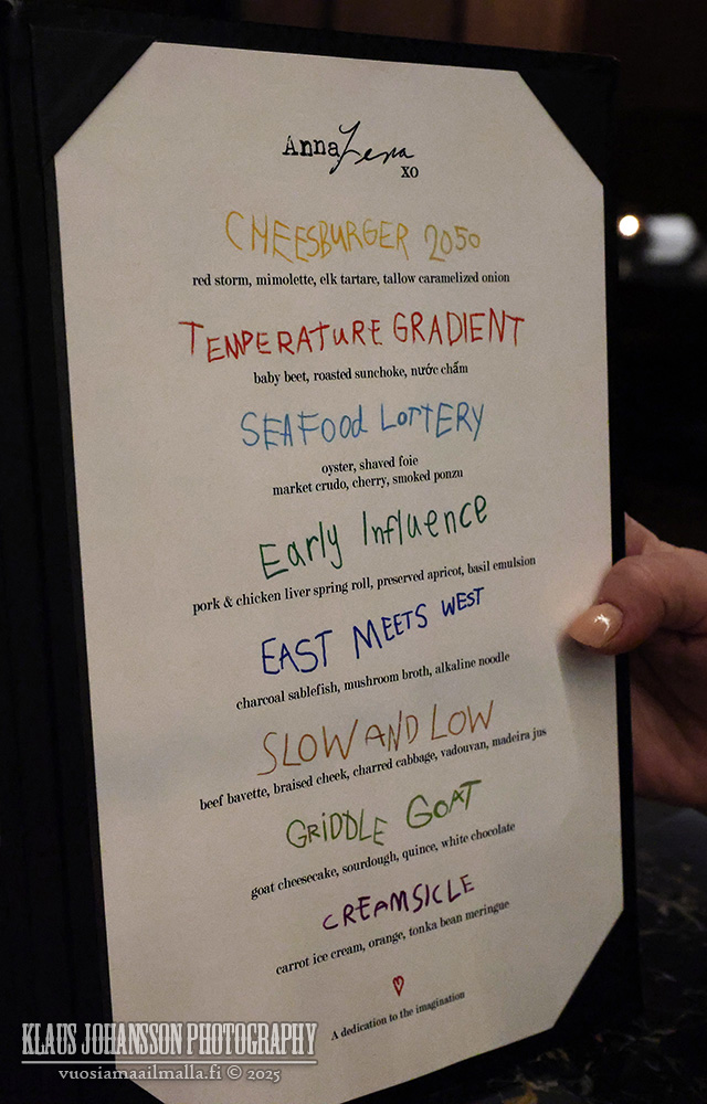 AnnaLenassa valittavissa on ainoastaan $154 hintainen kahdeksan ruokalajin maistelumenu, johon on kuitenkin otettavissa lisähintaan päivitys, jonka Niina päätyi ottamaan. Päivityksellä on hintaa peräti $100 ja sillä saa lisäyksen yhteensä kolmeen ruoka-annokseen, mikä ei kuitenkaan jälkikäteen arvioituna ollut täysin hinnan arvoinen.